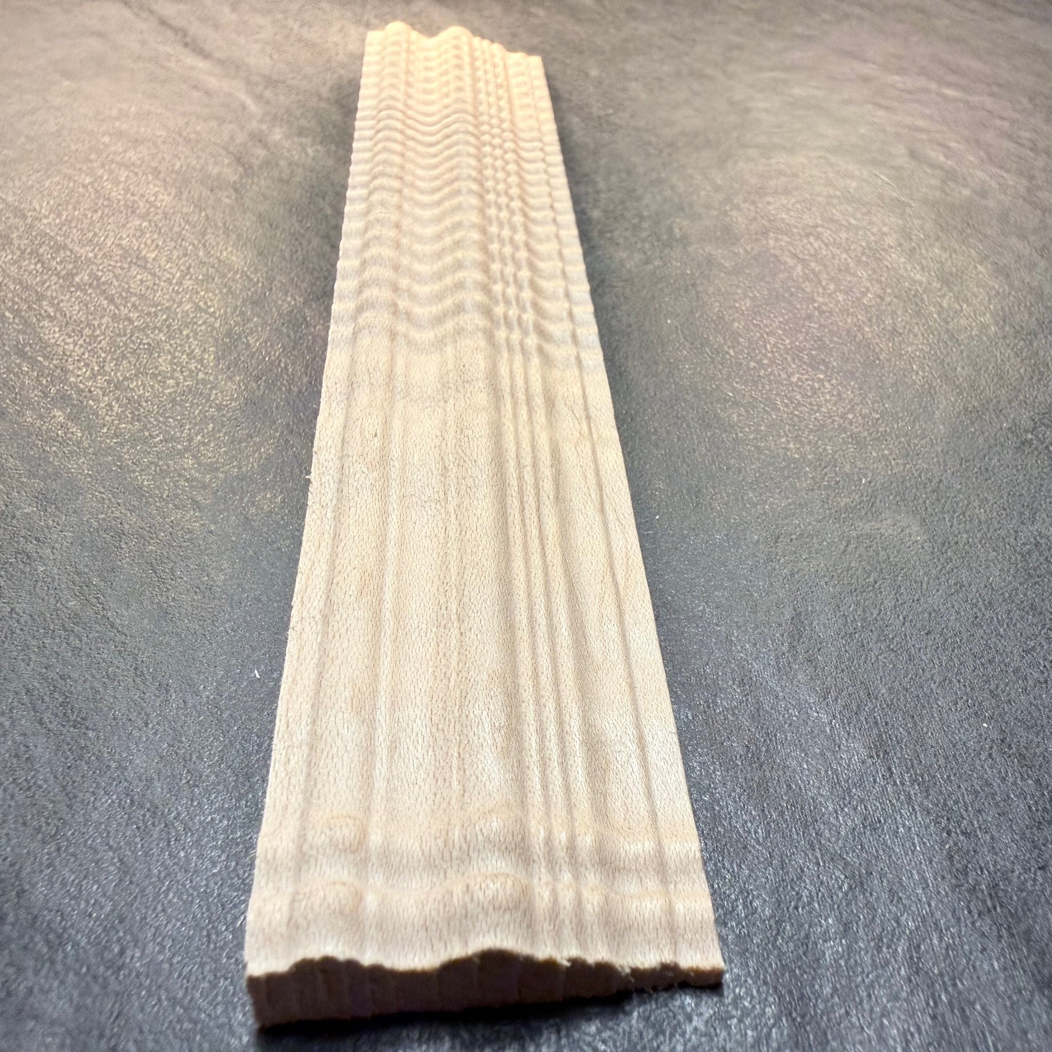 Ripple molding #414-46 is about 1-3/16" wide and nearly 3/8" high. Price is per 5-foot maple length. Cherry and walnut also available. Inquire here.