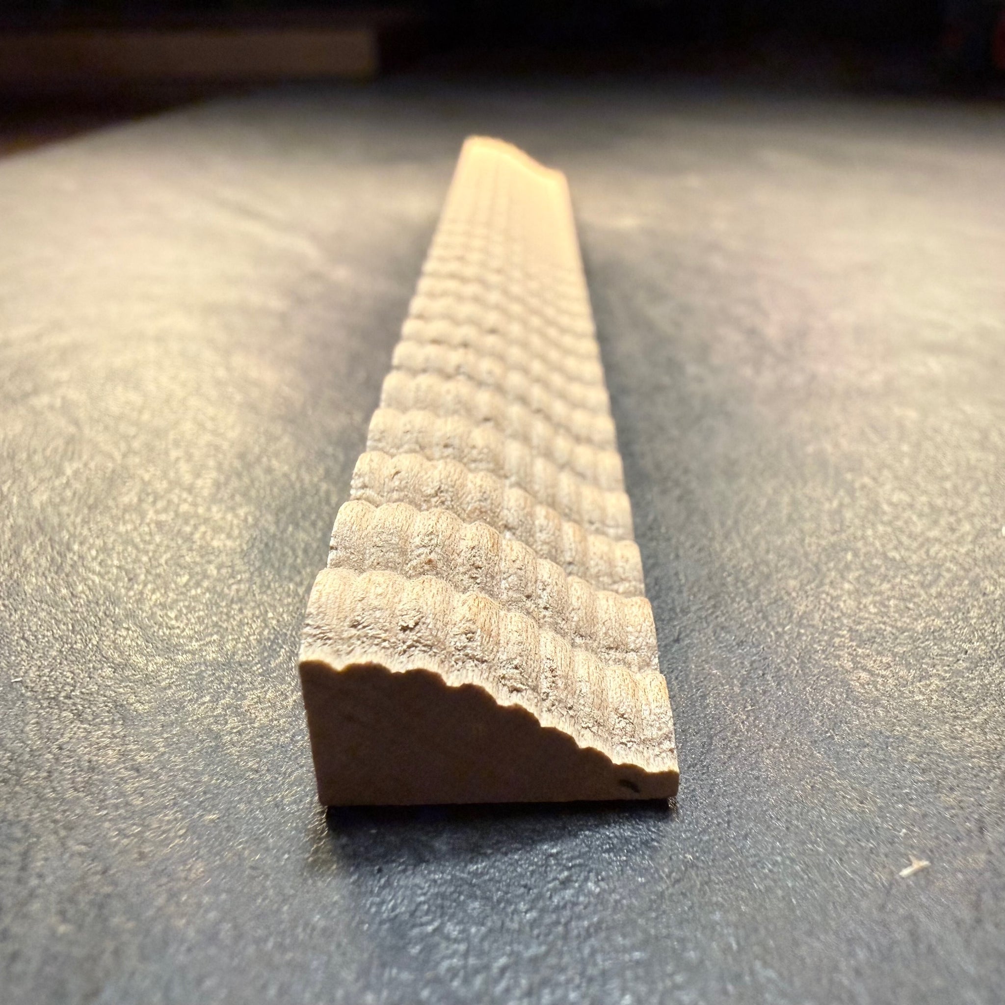 Ripple molding #412-38 is nearly 5/8" wide and nearly 3/8" high. Price is per 5-foot maple length. Cherry and walnut also available. Inquire here.